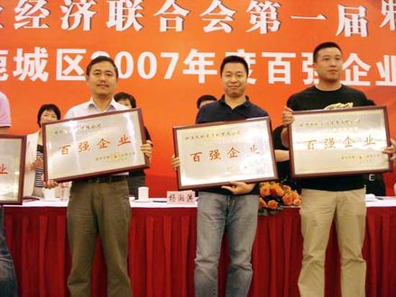我公司代表虞璟瀚(中)上臺領(lǐng)取2007年度鹿城區(qū)百強企業(yè)榮譽牌匾