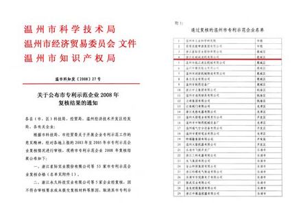根據(jù)市科技局、市經(jīng)貿(mào)委關(guān)于開展企業(yè)專利示范工作的意見精神,經(jīng)對各地上報(bào)的2003年至2005年市專利示范企業(yè)復(fù)核情況進(jìn)行審核,53家溫州市企業(yè)順利通過市專利示范企業(yè)復(fù)核,其中鹿城區(qū)7家,我公司榮列其中。