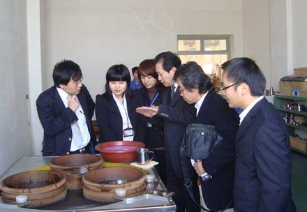 虞培清董事長正在為高橋幸司教授等與會人員解釋產(chǎn)品工藝流程情況