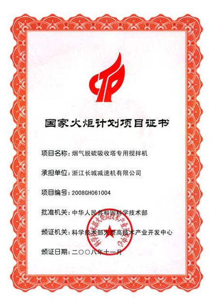“煙氣脫硫吸收塔專用攪拌機(jī)”國家火炬計劃項目證書