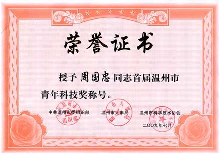 溫州市青年科技獎(jiǎng)榮譽(yù)證書