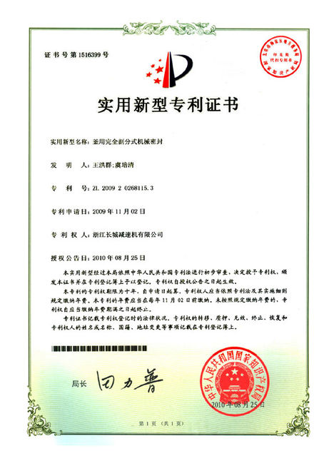 ZL 2009 2 0268115.3 釜用完全剖分式機(jī)械密封
