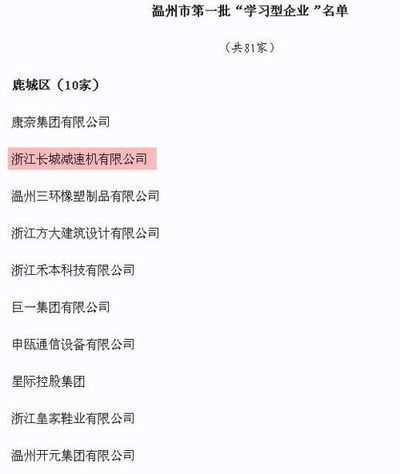日前,溫州市創(chuàng)建學(xué)習(xí)型黨組織工作領(lǐng)導(dǎo)小組辦公室對(duì)在各縣(市、區(qū))開(kāi)展學(xué)習(xí)型企業(yè)創(chuàng)建工作中涌現(xiàn)出的先進(jìn)單位進(jìn)行表彰。我公司被授予溫州市第一批“學(xué)習(xí)型企業(yè)”榮譽(yù)稱號(hào)。