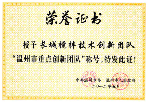 熱烈祝賀我公司“長(zhǎng)城攪拌技術(shù)創(chuàng)新團(tuán)隊(duì)”被授予“溫州市重點(diǎn)創(chuàng)新團(tuán)隊(duì)”稱號(hào)