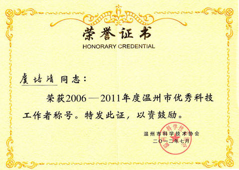“2006-2011年度溫州市優(yōu)秀科技工作者”稱號