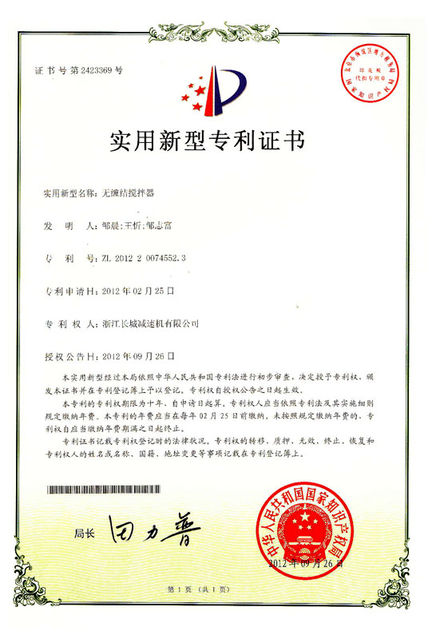 熱烈祝賀我公司“無纏結(jié)攪拌器”獲實(shí)用新型專利