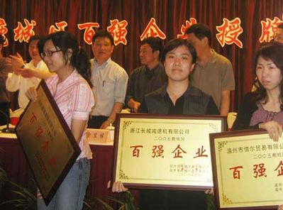 浙江長城減速機有限公司劉潔(中)代表公司領(lǐng)取“2005鹿城區(qū)百強企業(yè)”牌匾