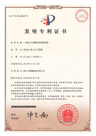 一種適合于凝聚洗滌用攪拌器--國(guó)家發(fā)明專利證書