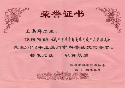 我司技術中心教授級高工王洪群同志撰寫的《我不曾現身卻是你無處不在的朋友》榮獲“2014年度溫州市科普征文三等獎”。
