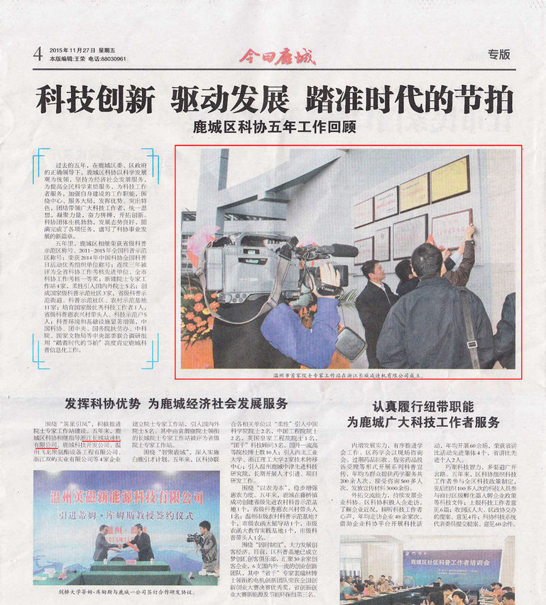 《溫州商報(bào)》、《今日鹿城》報(bào)道溫州市首家院士工作站在我司成立