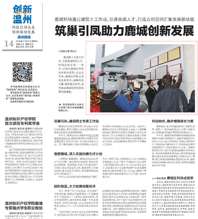 《溫州商報(bào)》、《今日鹿城》報(bào)道我司院士工作站