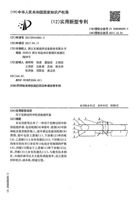 熱烈祝賀我司“用于發(fā)酵過程中的消泡攪拌器”獲國家實用新型專利