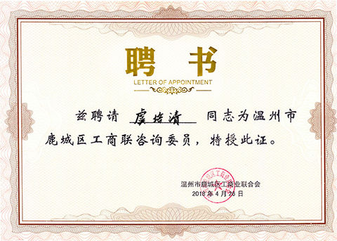 熱烈祝賀我司董事長虞培清被聘為“溫州市鹿城區(qū)工商聯咨詢委員”