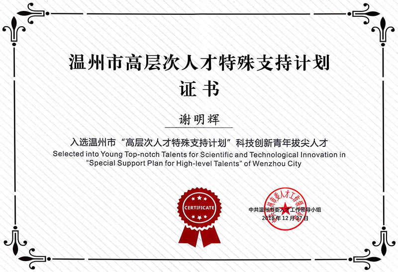 近日,溫州市隆重召開“全市創(chuàng)新創(chuàng)業(yè)人才獎勵大會”,市領導陳偉俊等出席會議,并為獲得國家和省、市重大人才工程入選的人才和團隊進行表彰獎勵。 我公司技術團隊入選首批溫州市高水平創(chuàng)新團隊,謝明輝博士入選首批高層次人才特殊支持計劃科技創(chuàng)新青年拔尖人才。
