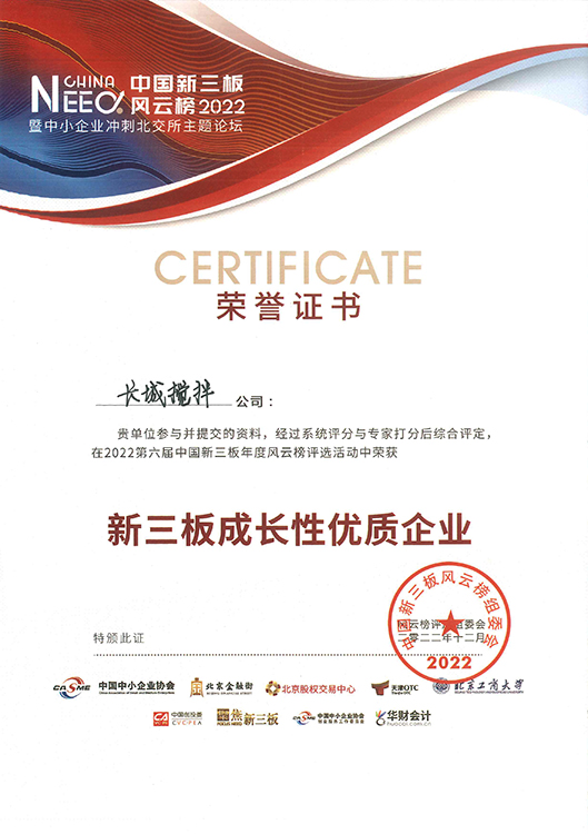 2022年12月9日,第六屆中國新三板年度風(fēng)云榜在北京成功舉辦,此次大會(huì)以“中小企業(yè)沖刺北交所”為主題,大會(huì)采用“線下論壇+線上直播”的方式呈現(xiàn),長城攪拌(839894)憑借著出色表現(xiàn)以及高成長性,榮獲“新三板成長性優(yōu)質(zhì)企業(yè)”獎(jiǎng)。