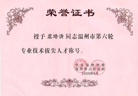 虞培清董事長榮獲“溫州市第六輪專業(yè)技術(shù)拔尖人才”稱號
