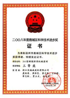 “261型側(cè)攪拌用機械密封”鹿城區(qū)科學(xué)技術(shù)進步三等獎證書