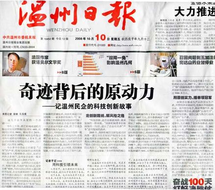 2008年10月10日《溫州日報》頭版,題為“奇跡背后的原動力”報道了我公司等溫州民企在科技創(chuàng)新方面的事跡。 2008年10月10日《溫州日報》頭版 記者:章映、馬玉瑛 摘錄部分報道如下...
