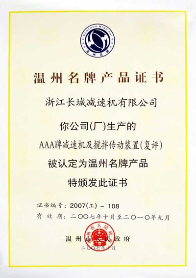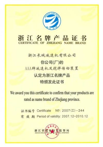 2007年12月11日,浙江質量技術監(jiān)督局對2007年浙江名牌產品名單予以網上公示,由我公司生產的AAA牌減速機及攪拌傳動裝置獲此殊榮。      浙江省名牌產品,...